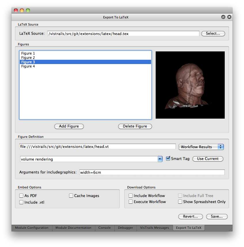 We have been investigating better methods to modify embedded computational results more directly. As part of this work, we have extended the current embedding assistant to parse LaTeX source files so that users can examine and modify the results more directly. A screenshot of this updated assistant is shown below. We plan to release this functionality in a future version of VisTrails.