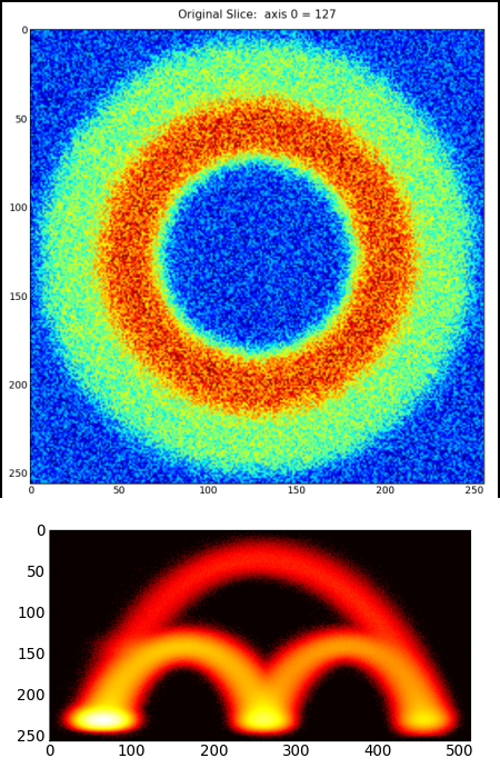 The above image is the sphere data and joint histogram discussed in class. Which material boundary is highlighted by the small arc on the right-side of the histogram? The colors in the original dataset can be interpreted as: