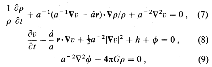 <math>~\frac{\partial\psi}{\partial t} - \frac{\dot{a} \mathfrak{x}}{a} \cdot \nabla_\mathfrak{x} \psi~+ \frac{1}{2} a^{-2}( \nabla_\mathfrak{x} \psi )^2 + H + \Phi </math> |