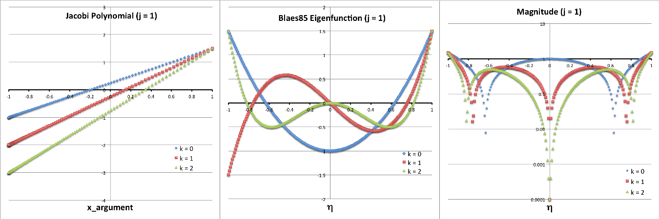 Table 3 presents the first three eigenfunctions (j = 0, 1, 2), along with each corresponding eigenfrequency; the figure displayed in the right-most column has been extracted directly from §22 (p. 773) of Abramowitz and Stegun's (1964) Handbook of Mathematical Functions (tenth printing, December 1972, with corrections) and shows the behavior of the lowest five Jacobi polynomials (j = 1, 2, 3, 4, 5, as labeled) over the interval <math>~-1 \le x \le +1</math> and for the specific case of <math>~(\alpha,\beta) = (1.5, - 0.5)</math>.