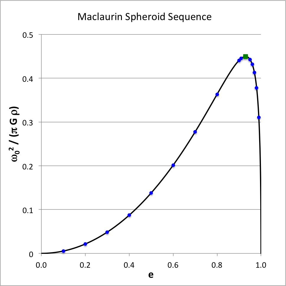 | Examining the Maclaurin spheroid sequence "… we see that the value of <math>~\omega_0^2</math> increases gradually from zero to a maximum as the eccentricity <math>~e</math> rises from zero to about 0.93, and then (more quickly) falls to zero as the eccentricity rises from 0.93 to unity." … "If the angular velocity exceed the value associated with this maximum, "… equilibrium is impossible in the form of an ellipsoid of revolution. If the angular velocity fall short of this limit there are always two ellipsoids of revolution which satisfy the conditions of equilibrium. In one of these the eccentricity is greater than 0.93, in the other less." |