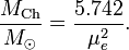 <math> \frac{M_\mathrm{Ch}}{M_\odot} = \frac{5.742}{\mu_e^2} .