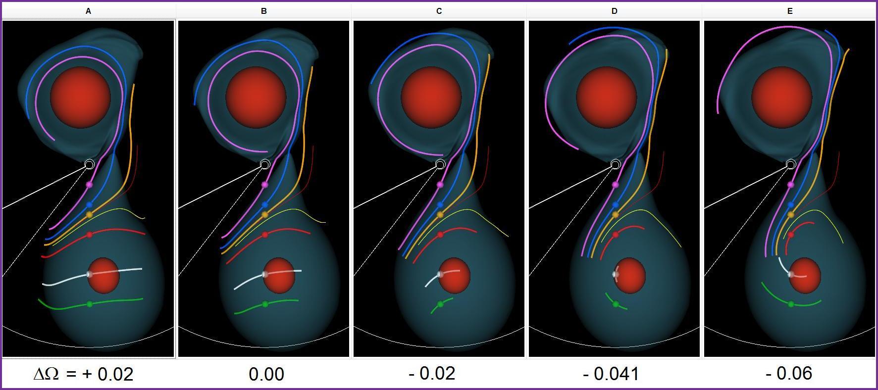 We'd like to determine which value of <math>\Delta\Omega</math> provides the best measure of the binary star system's true orbital period. As expected, for all five choices of <math>\Delta\Omega</math>, we found the highest velocities (marked by the longest streamlines) along the relatively low-density mass-transfer stream that connects the two stars. Material from the donor star (in the lower half of each rendered image in Figure 2) flows toward its stellar companion, reaching supersonic velocities before impacting the companion. An oblique shock front &#150; whose location is delineated by kinks in the pink, blue, and orange streamlines &#150; terminates the component of motion perpendicular to the companion's surface. Motion transverse to the shock becomes orbital motion in a thick, low-density disk that surrounds the companion star.
