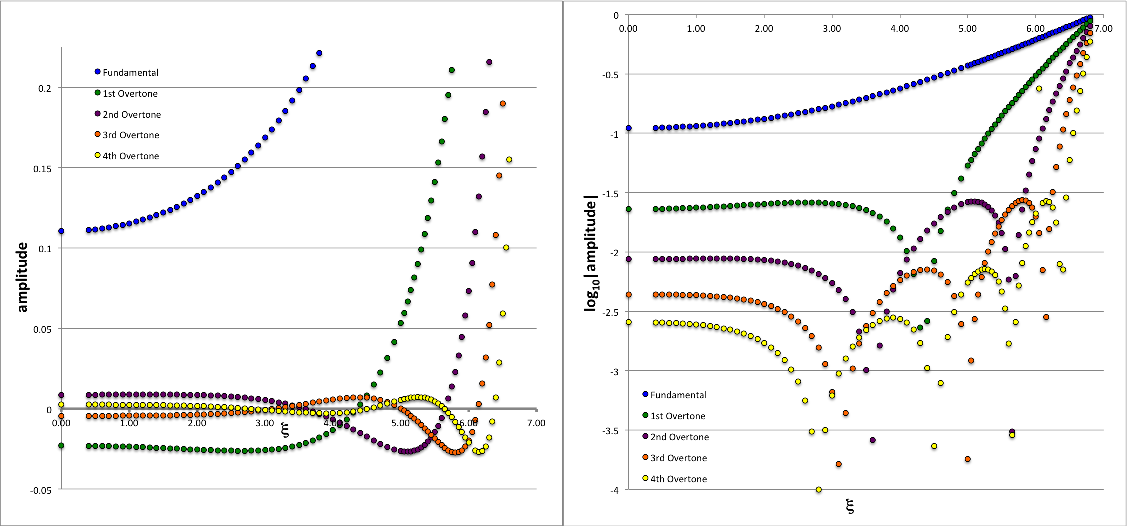 Schwarzschild (1941) also documented the radial structure of the eigenfunction that is associated with each of these twenty model/mode eigenfrequencies. Each column of his Table 4, except the first, presents numerical values of the amplitude of a specific model/mode at 84 discrete radial locations throughout the n = 3 polytrope; the first column of the table lists the corresponding radial coordinate, <math>~\xi</math>. Focusing on the model that he analyzed assuming <math>~\alpha = 0.4</math>, we have typed his five columns of data into an Excel spreadsheet and have used this data to generate the pair of plots displayed, below, in Figure 1. The left-hand panel displays the eigenfunction amplitude versus radius, <math>~x(\xi)</math>, for the fundamental mode as well as for the first four overtones; it essentially replicates Figure 1 from Schwarzschild (1941). The right-hand panel displays the same data, but as a semi-log plot; specifically, it displays <math>~y(\xi)</math>, where,