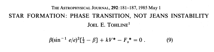 Finally, realizing that the square of the sound speed is related to our <math>~c_\mathrm{norm}^2</math> via the relation [note that Tohline (1985) uses <math>~a^2</math> in place of <math>~c_s^2</math>], <math>~c_s^2 = \biggl( \frac{3}{4\pi} \biggr) c_\mathrm{norm}^2 \, ,</math> it is clear that this last form of our "free energy extrema" expression is identical to Tohline's (1985) virial equilibrium equation (9), which appears in print in a simpler but also more cryptic form as,