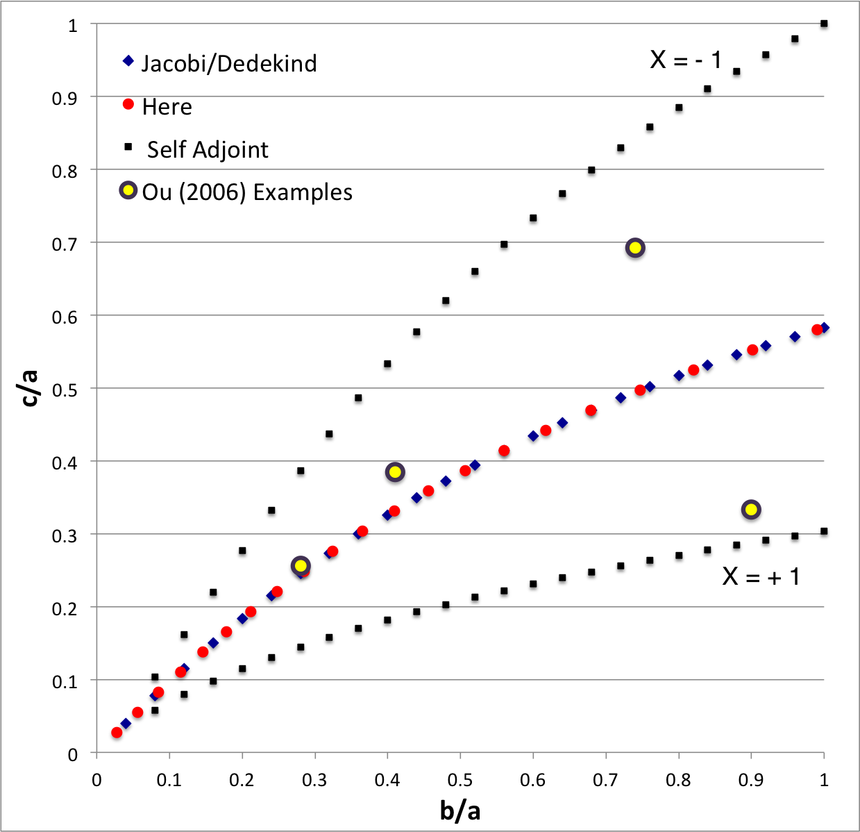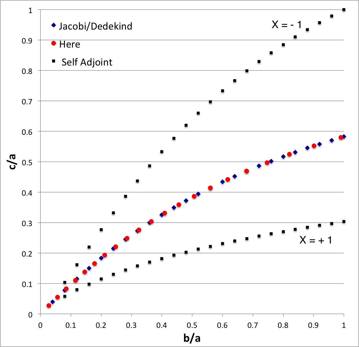 | <math>~\frac{b}{a}</math> | <math>~\frac{c}{a}</math> | <math>~a^2 A_{12}</math> | <math>~ B_{12}</math> | <math>~\alpha \equiv \frac{(b/a)^2}{[ 1 + (b/a)^2]^2} </math> | <math>~\beta \equiv \biggl[ \frac{2 B_{12}}{(c/b)^2 A_3 - a^2 A_{12}} \biggr]\frac{1}{1 + (b/a)^2} </math> | Direct | Adjoint | ||