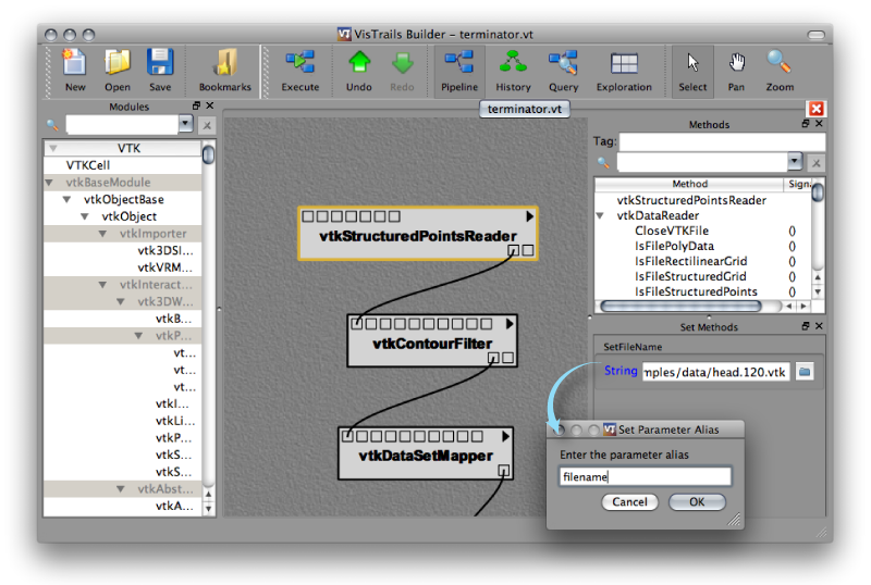 We want to expose only the dataset name and the isovalue in the bookmark. We first select the vtkStructuredPointsReader module and in the Set Methods panel we click over the parameter type (the word String) of SetFileName. This will pop up a window where we can type a name, as shown in Figure 2.