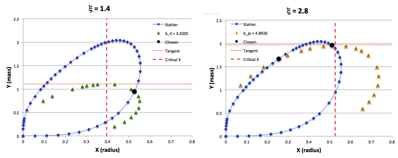 The entire sequence will be traversed by varying the Lane-Emden parameter, <math>~\tilde\xi</math>, from zero to infinity. In each of the figure panels presented below, Stahler's mass-radius relation has been plotted using the solution to the quadratic equation; points along the sequence derived from the positive root are shown in green while those derived from the negative root are shown in blue. But also in each panel, the pair of parametric equations has been used to identify the specific equilibrium configuration that corresponds to a particular choice of <math>~\tilde\xi</math>, as indicated.