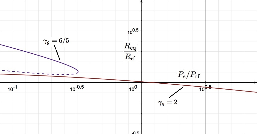 Top: The solid red curve shows how the equilibrium radius <math>(R_\mathrm{eq})</math> of an <math>~n</math> = 1 <math>(\gamma_g = 2)</math> polytrope varies with applied external pressure, <math>P_e</math>; similarly, the purple curve shows the <math>R_\mathrm{eq}(P_e)</math> behavior for an <math>~n</math> = 5 <math>(\gamma_g=6/5)</math> polytrope. Logarithmic units are used along both axes; <math>P_e</math> is normalized to <math>P_\mathrm{rf}</math> and <math>R_\mathrm{eq}</math> is normalized to <math>R_\mathrm{rf}</math>, as defined in the text and in the accompanying ASIDE.