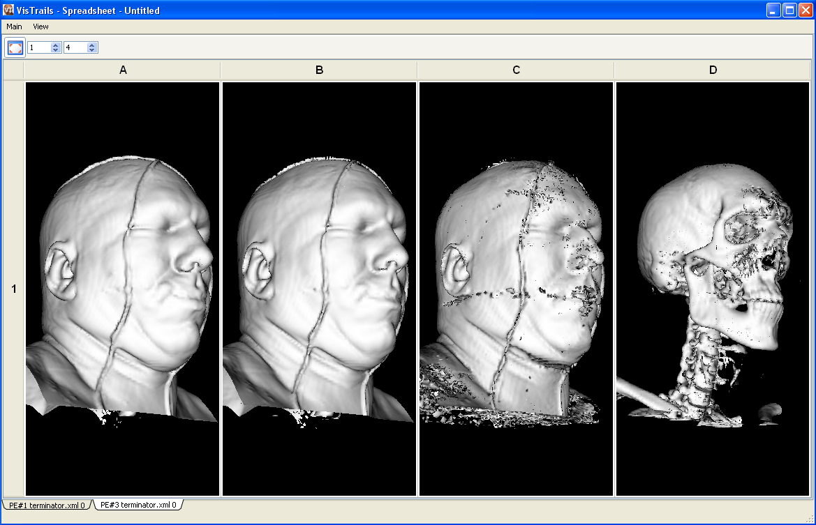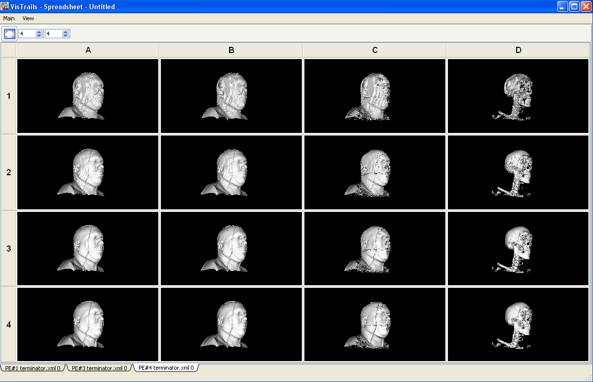 VisTrails Parameter Exploration is Spreadsheet-aware, so you can map the intermediate results from explorations into cells of the Spreadsheet. Because the Spreadsheet provides a multi-view interface that makes efficient use of screen space, you can quickly compare the results of different parameter settings. The changes in parameters can be displayed across rows, columns, and sheets. In addition, parameters can be explored across timesteps, and then displayed in the Spreadsheet as animations. This could be used, for example, to show how pathological tissues and tumors are affected by radiation treatment in a series of scans.