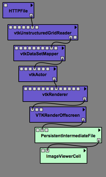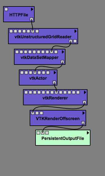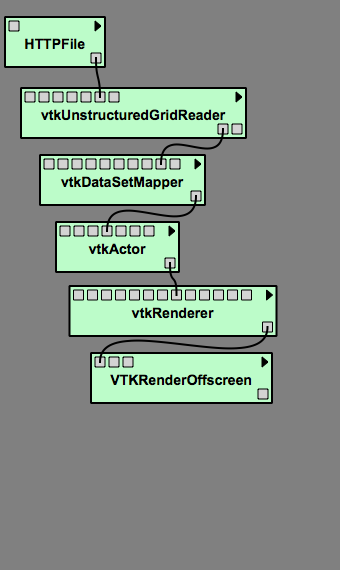 1. Drag the following modules to the canvas and connect them in the order in which they are named: HTTPFile, vtkUnstructuredGridReader, vtkDataSetMapper, vtkActor, vtkRenderer, VTKRenderOffscreen. Refer to Figure Example 1.1 to ensure connections are correct.