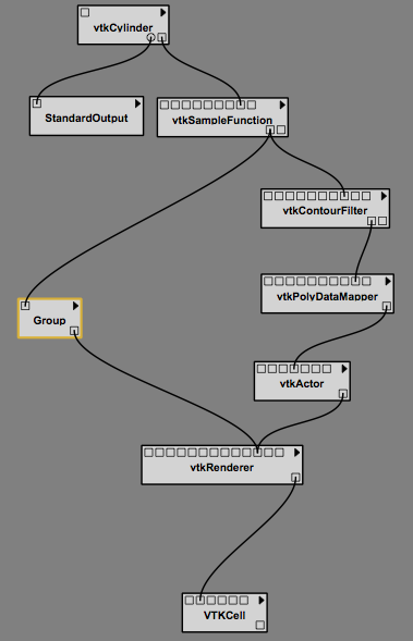 As the number of modules in a pipeline increases, the pipeline can grow quite large and cumbersome. This also makes the pipeline more difficult to understand and maintain. With any large system, it can be helpful to cluster related pieces together and represent them as a single unit. This idea, called encapsulation, is commonly used in computer programming as a way of controlling complexity. VisTrails likewise supports the grouping of multiple modules together so that they can be treated as a single module. This “group” module can be thought of as a monolithic entity that performs all the same functions as its individual parts, but shields its inner details from everyone else. As such, a group module inherits all the input and output ports of the modules inside it, but only displays those ports that have connections to another module outside of the group. To borrow another term from programming languages, these visible ports might be considered the public interface of the group module.