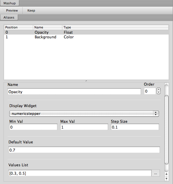 If you would like to be able to explore different values for a specific parameter, you will need to create an alias by double-clicking the parameter in the Parameter Aliases section. After naming the alias, you can select the alias in the Mashup tab (center panel), and configure the alias by selecting the Display Widget type and setting Default values.