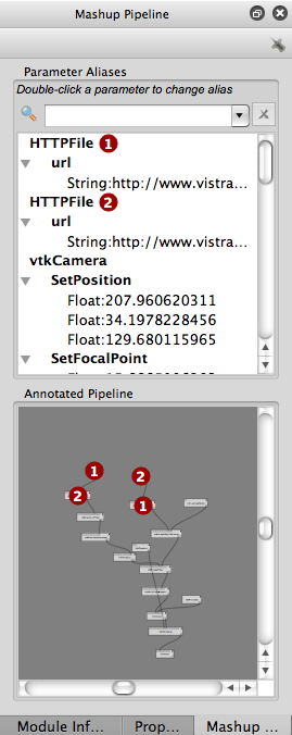 Numbered Modules - The HTTPFile modules 1 and 2 appear in the annotated pipeline and in the parameter aliases. The annotated pipeline also, numbers the vtkDataSetReader modules (which appear below the respective HTTPFile modules in the pipeline). Their parameters have not been exposed to the mashup, so they do not appear in the Parameter Aliases section.