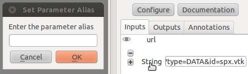 filename in the example above is the alias name assigned to the parameter in the value method inside the String module. When running a pipeline from the command line, VisTrails will try to start the spreadsheet automatically if the pipeline requires it. For example, this other execution will also start the spreadsheet (attention to how $ characters are escaped when running on bash):