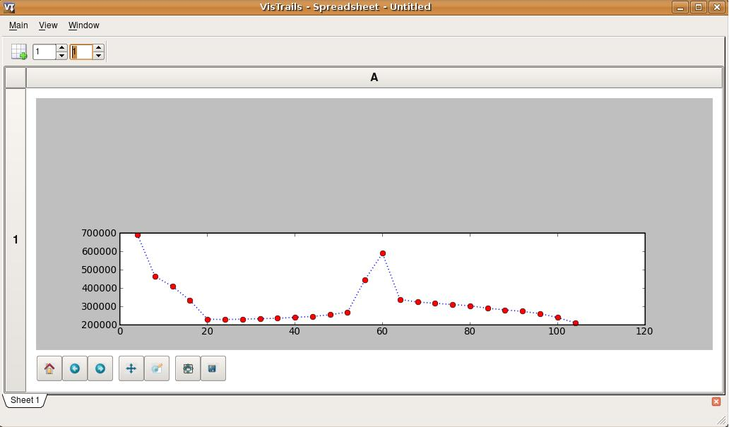 When the workflow finishes its execution, the VisTrails Spreadsheet will contain a 2D plot (Figure The result in the VisTrails Spreadsheet).