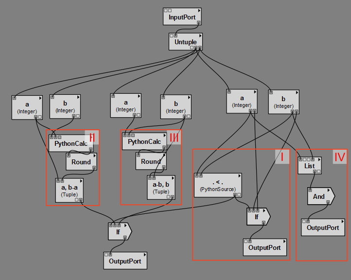 The PythonSource has two Integer inputs a and b, and a Boolean o