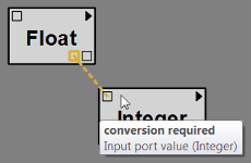 If the ports are not directly compatible, VisTrails may automatically insert a conversion module between the two ports. If such a module is about to be used, VisTrails will display the connection you are drawing with a dotted line (see Figure Automatic conversion).
