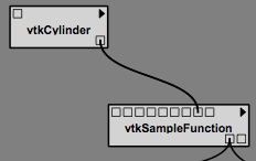 To connect the vtkCylinder module to the vtkSampleFunction module, place the cursor over the only output port on the vtkCylinder module, located on the bottom right. A tooltip should appear that reads “Output port self (vtkCylinder).” Left click on the port and drag the mouse over the vtkSampleFunction module. The connection should snap to the fourth input port from the left. Hovering the mouse over this port shows a tooltip that reads “Input port SetImplicitFunction (vtkImplicitFunction).” Release the mouse button to complete the connection between these two modules (see Figure The connection replaced). To check for a valid dataflow, execute the workflow by pressing the Execute button on the toolbar, and see if the results appear in the spreadsheet.