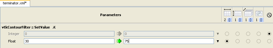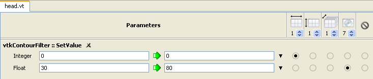We’d like to compare different values for the isosurfaces so change the start and end values of the “Float” parameter to “30” and “75”. Since side-by-side visualization will look better on most monitors, select the radio button below the ‘x’ dimension control, and increase the value of the control to 2 (see Figure Setting values for parameter exploration). Execute the exploration and switch to the Spreadsheet to view the results. They should match Figure Parameter Exploration of two isovalues.... (Open result)