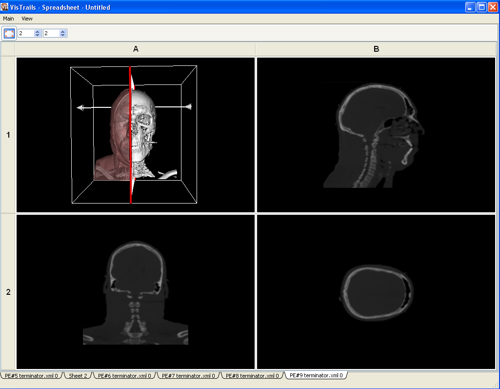 VisTrails Parameter Exploration is Spreadsheet-aware, so you can map the intermediate results from explorations into cells of the Spreadsheet. Because the Spreadsheet provides a multi-view interface that makes efficient use of screen space, you can quickly compare the results of different parameter settings. The changes in parameters can be displayed across rows, columns, and sheets. In addition, parameters can be explored across timesteps, and then displayed in the Spreadsheet as animations. This could be used, for example, to show how pathological tissues and tumors are affected by radiation treatment in a series of scans.