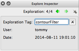 New parameter explorations are saved automatically when they are executed. The inspector (below) has buttons for moving back and forward through the history of parameter explorations. Explorations can be tagged with a name, which will make them visible in the workspace view.