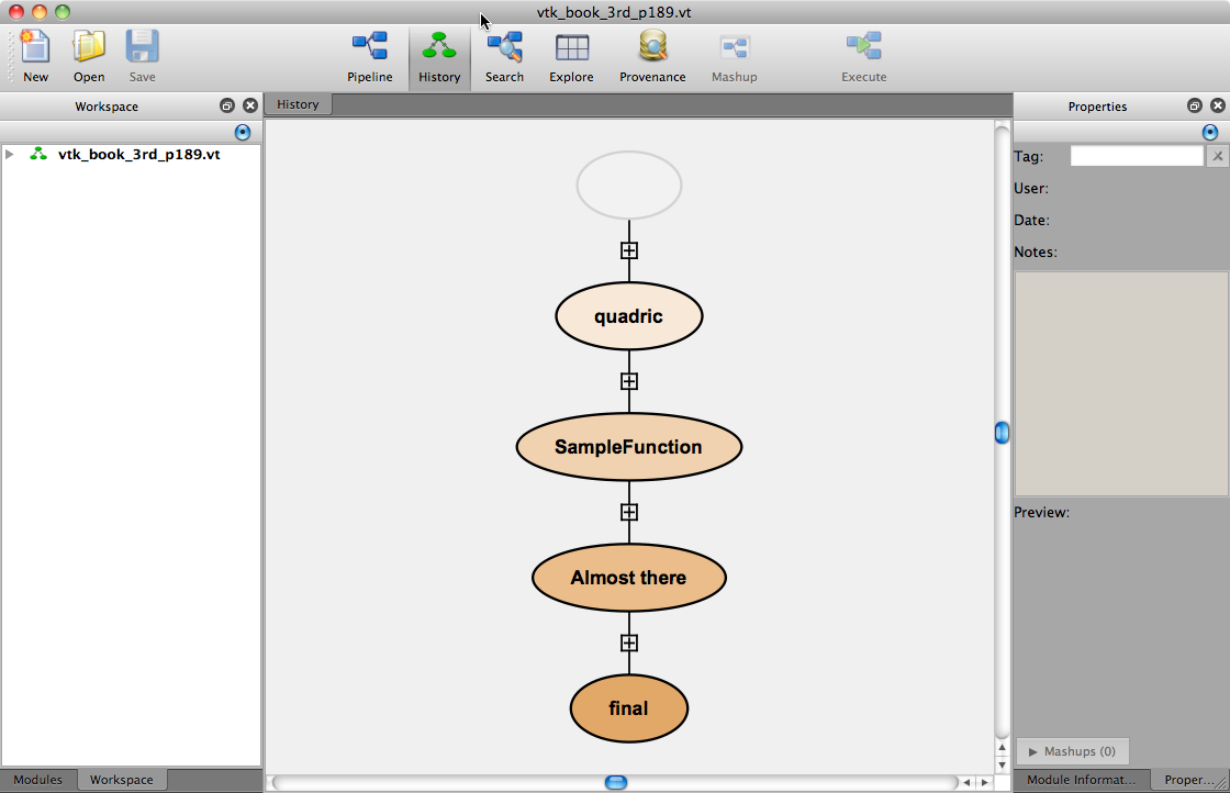 The History button on the VisTrails toolbar lets users interact with a workflow history. It consists of a tree view in the center and the Properties tool container on the right for querying and managing version properties (see Figure In History mode, you can examine...). Versions are displayed as ellipses in the tree view where the root of the tree is displayed at the top of the view. The nodes of the tree correspond to a version of a workflow while an edge between two nodes indicates that one was derived from the other.
